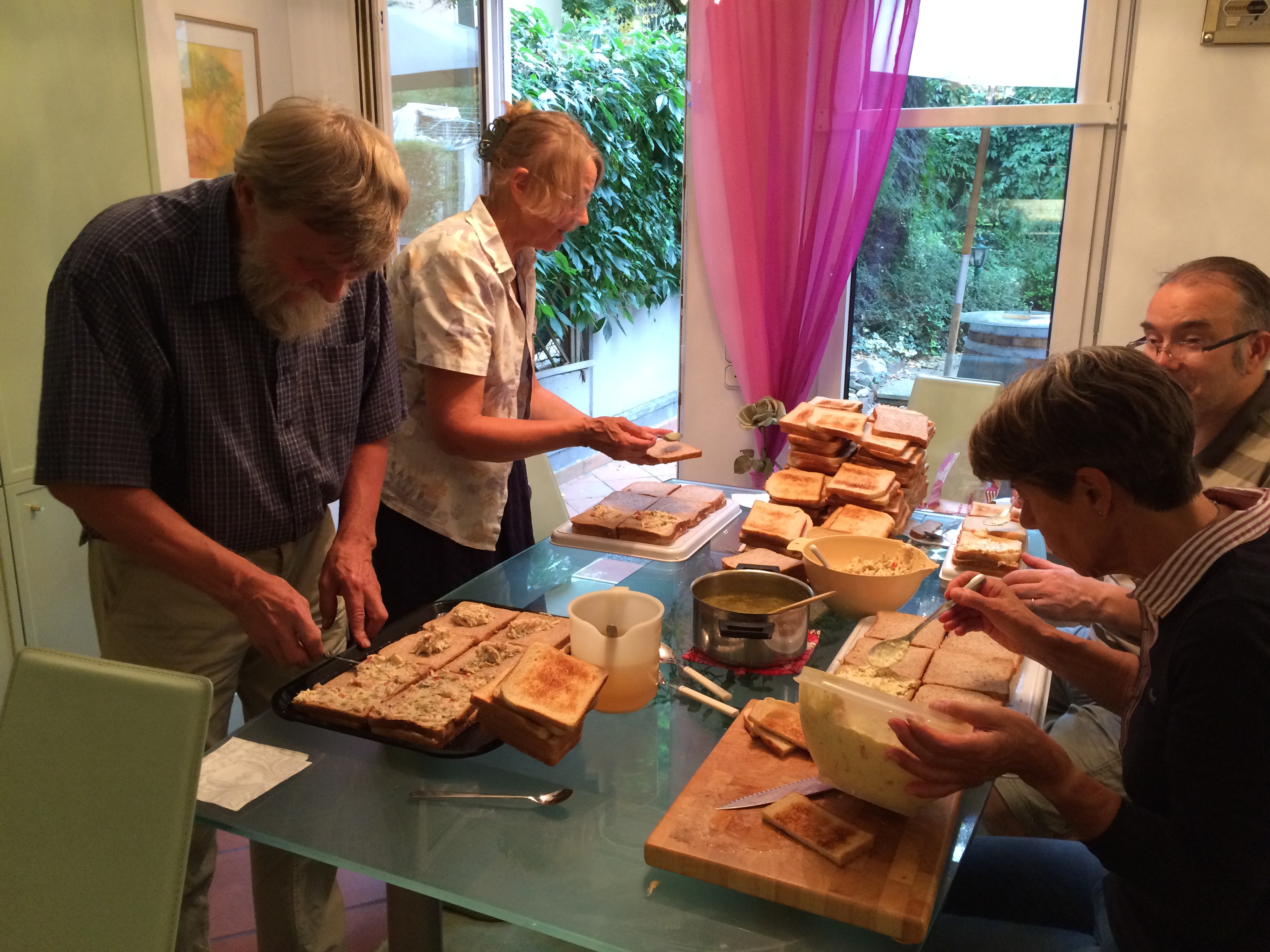 Ich nahm für diese Zeit etwas mehr als eine Woche frei, um nach dem Konzert auch im Lager arbeiten zu können. Unsere Aufgabe beim Konzert bestand darin, das Essen bereitzustellen. Anne wusste schon, dass finnische Sandwichtorten und die österreichische Sachertorte immer gerne gegessen werden, daher fiel die Entscheidung nicht schwer. Anne war zu diesem Zeitpunkt gerade in Finnland, sie gab uns allerdings eine Einkaufsliste. Wir gingen mit dem stets hilfsbereiten Hannu in einen lokalen Großmarkt, um alle nötigen Zutaten einkaufen. Am Samstagvormittag bekam unser Team Verstärkung aus Ungarn, und zwar durch Maritta und Aarno, die schon Erfahrung bei der Zusammenstellung von Sandwichtorten hatten. Als Anne am Nachmittag aus Finnland zurückkam, lief alles bereits, und am Abend war alles fertig. Die Sachertorten wollten wir fertig kaufen.