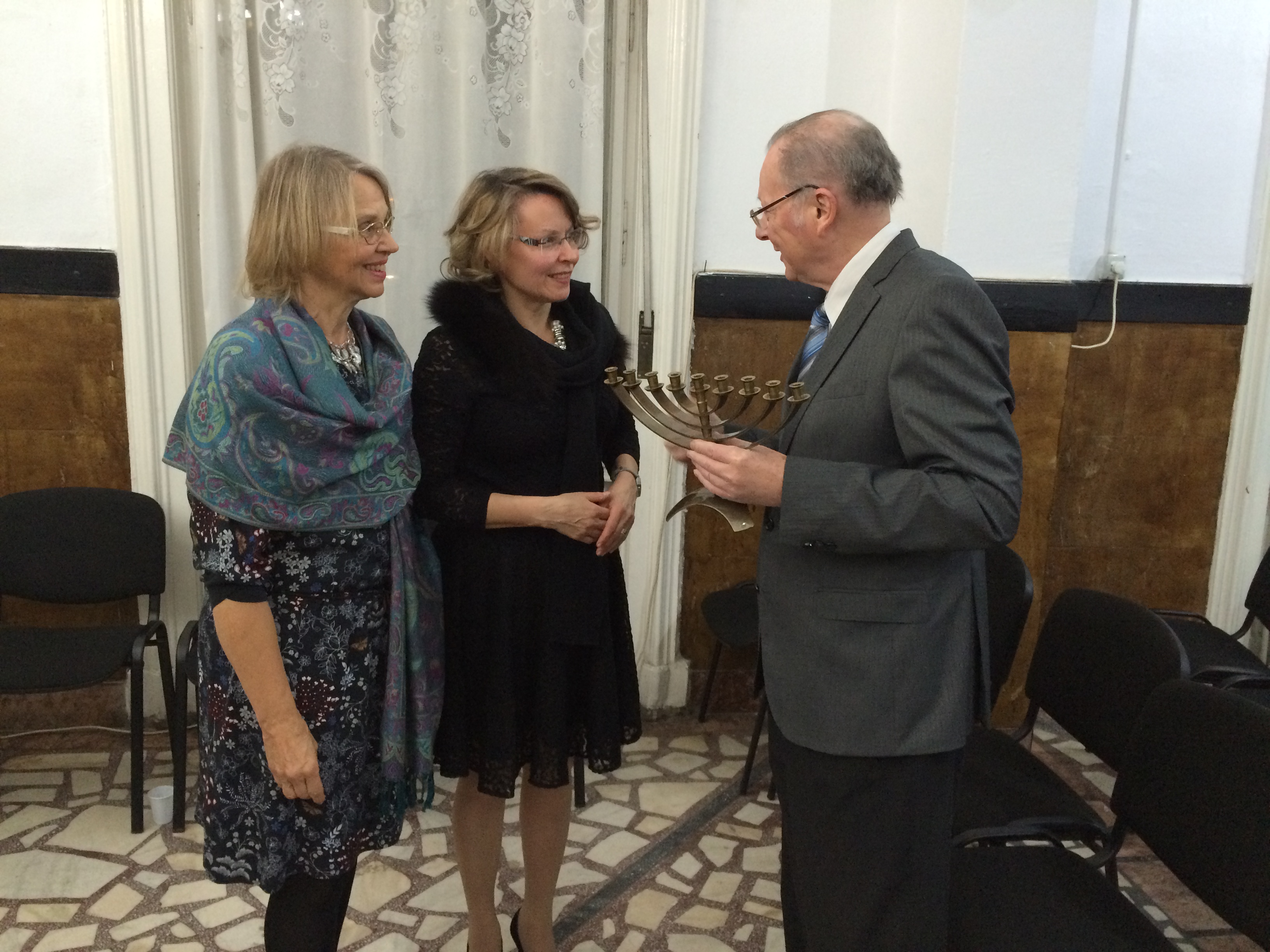 Nach dem Konzert übergaben Maritta und Anne an Präsident Schlesinger (Foto) eine Chanukkia, die dem Verein gespendet worden war. Wir hatten gemeinsam beschlossen, diese besondere Spende dem Altersheim zu übergeben, das nach den Vereinsgründern von HILFE und HOFFNUNG benannt ist.